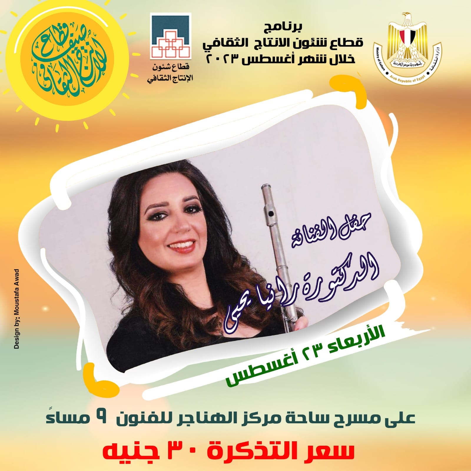 تحت رعاية الدكتورة نيفين الكيلانى وزيرة الثقافة، تحيى الفنانة الدكتورة رانيا يحيى، الليلة السابعة لبرنامج “صيف الإنتاج الثقافى”، الذى ينظمه قطاع شئون الإنتاج الثقافى برئاسة المخرج خالد جلال، فى التاسعة من مساء غد الأربعاء ٢٣ أغسطس، على مسرح ساحة مركز الهناجر للفنون.