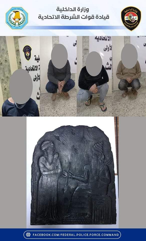 تمكنت قوة من اللواء الثاني الفرقة الأولى شرطة اتحادية بالاشتراك مع مفرزة من شعبة استخبارات الفوج الثالث للواء ومفرزة من مديرية الجريمة المنظمة ، من إلقاء القبض على أربعة متهمين بالجرم المشهود بتجارة القطع الأثرية في منطقة ( المشتل حي المعلمين ) ببغداد ، حيث تمت عملية إلقاء القبض من خلال توفر معلومة استخبارية دقيقة بتواجد عصابة تقوم بتجارة القطع الأثرية ضمن قاطع المسؤولية ، وبعد نصب كمين محكم ضمن المنطقة تم إلقاء القبض على المتهمين وضبط بحوزتهم قطعة أثرية نادرة ،