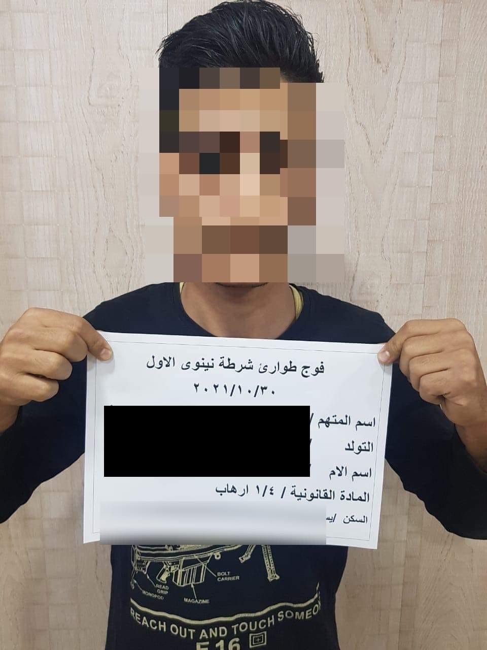 تمكن فوج طوارئ الشرطة الأول في شرطة نينوى، وبعد ورود معلومات مؤكدة ومن خلال البحث والتحري والمتابعة المستمرة، من القاء القبض على الإرهابي المكنى ( ابو البراء ) والذي كان يعمل بصفة مقاتل فيما يسمى ( فرقة الفرقان القتالية ) خلال فترة سيطرة داعش على مدينة الموصل ، علما توجد بحقه مذكرة قبض صادرة عن القضاء وفق المادة ٤ \ ١ إرهاب.
