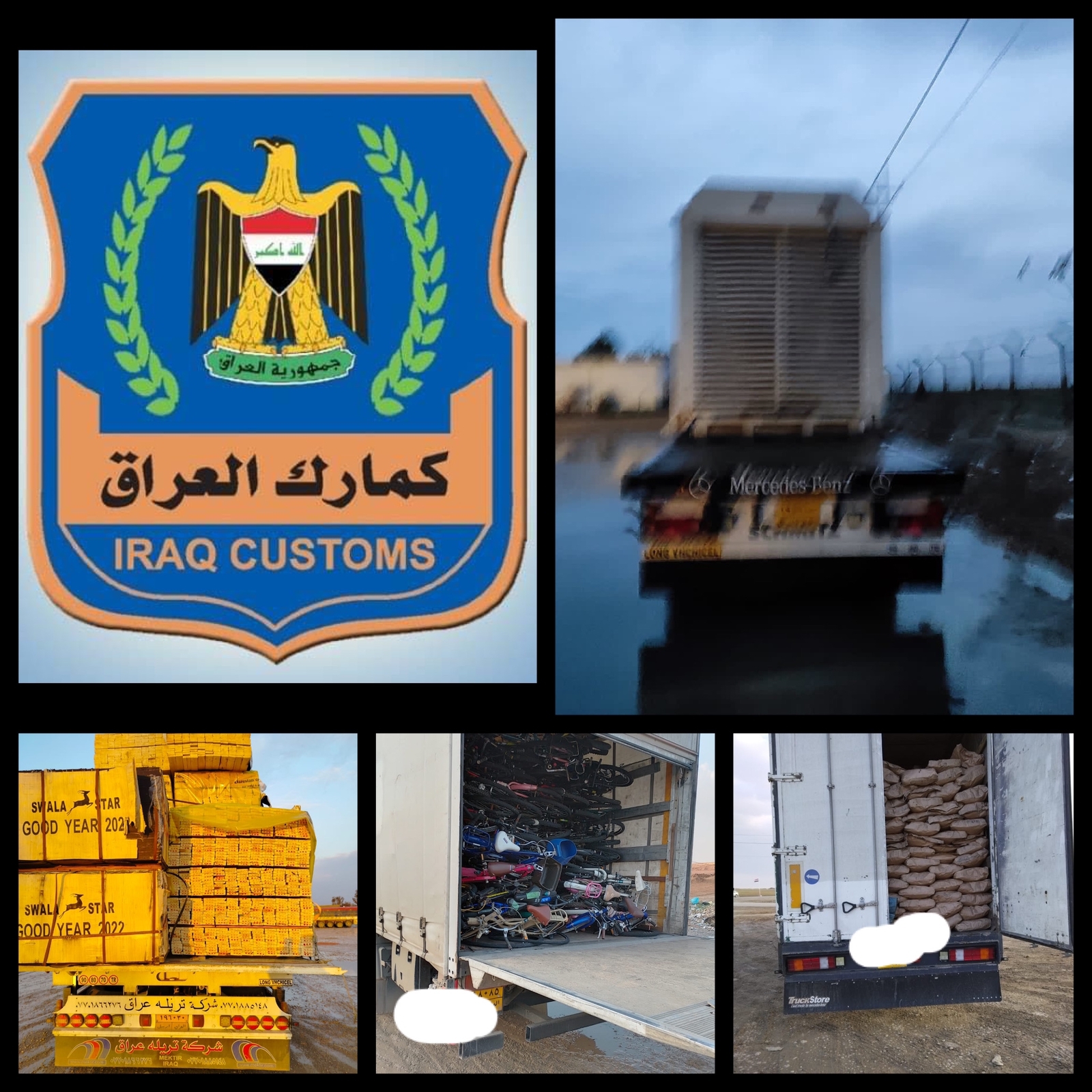 اعلنت الهيئة العامة للكمارك اليوم الثلاثاء عن ضبط ( ١١ ) شاحنة من قبل قسم التحري و مكافحة التهريب في مديرية كمرك المنطقة الشمالية (مواد كهربائية وخزان حديدي وملحقاته و مولد كهربائي و خشب ومواد غذائية مختلفة وادوات احتياطية للدرجات النارية والهوائية و دراجات هوائية مستعملة و فحم خشبي ) مخالفة للشروط و الضوابط الاستيرادية .