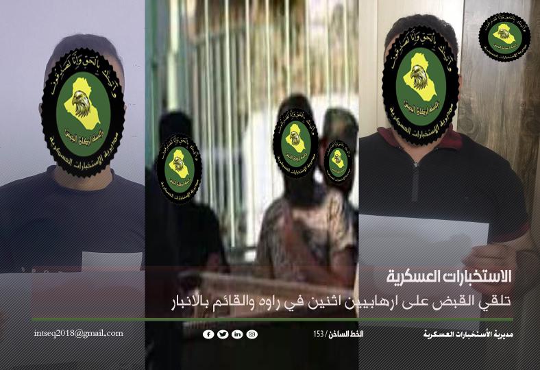 بعمليات نوعية واستباقية منفصلة نفذت استناداً الى معلومات دقيقة لشُعبْ استخبارات الفرق السابعة والعاشرة والخامسة عشر التابعة الى مديرية إلاستخبارات العسكرية في وزارة الدفاع , وبالتعاون مع قوة من قيادة القوات البرية في قواطع مسؤولية تلك الفرق اسفرت عن القاء القبض على ثلاثة ارهابيين مطلوبين للقضاء وفق المادة ٤إرهاب، اثنان منهم في القائم والاخر في مدخل الفلوجة اثناء محاولته دخول القضاء عبر سيطرة التحدي .