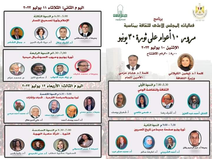 تحت رعاية وبحضور الدكتورة نيفين الكيلاني، وزيرة الثقافة، يُقيم المجلس الأعلى للثقافة، بأمانة الدكتور هشام عزمي، سلسلة من الندوات حول القضايا المرتبطة بالثورة ودورها في بناء الجمهورية الجديدة، احتفالًا بذكرى مرور ١٠ سنوات على ثورة ٣٠ يونيو، وذلك خلال الفترة من الإثنين ١٠ يوليو حتى الأربعاء ١٢ يوليو الجاري، وذلك بمقر المجلس الأعلى للثقافة.