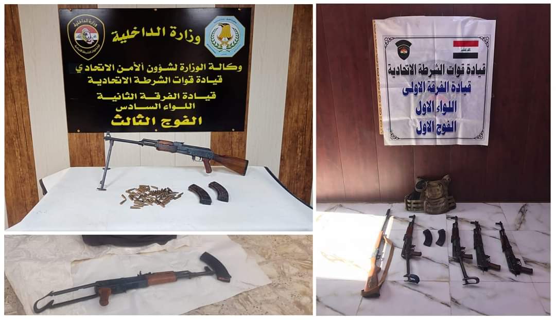 ضمن الجهود الأمنية المستمرة لقطعات الشرطة الاتحادية والرامية الى حصر السلاح بيد الدولة لضمان أمن سلامة المواطنين ، نفذت مفارز الشرطة الاتحادية في بغداد عمليات تفتيش في مناطق (النهروان ) ( مجمع الحكيم) و ( حي الفرات ) تمكنت خلالها من ضبط 7 بندقية مختلفة الانواع ، 5 مخازن بندقية ، درع نسيجي ، و90 إطلاقة.