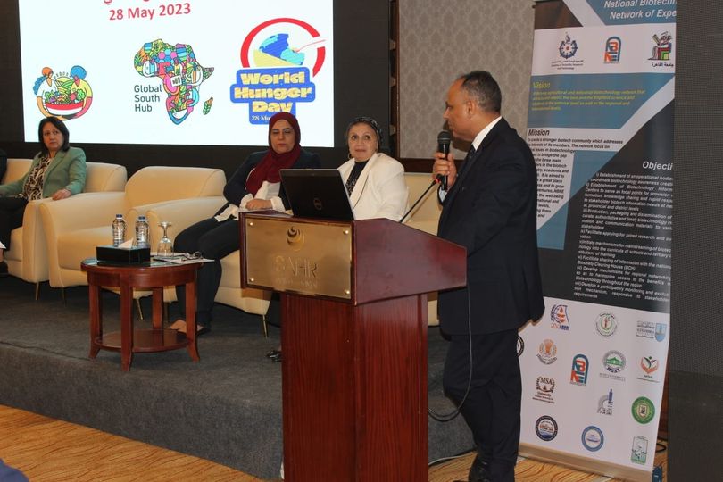 افتتح الدكتور محمود صقر، رئيس أكاديمية البحث العلمي والتكنولوجيا “ندوة التوعية باليوم العالمي للجوع”، وذلك بحضور الدكتور رمزى استينو، وزير البحث العلمي الأسبق، والدكتور علاء الدين حموية، المنسق الإقليمي للمركز الدولي للبحوث الزراعية في المناطق الجافة (ايكاردا)، والدكتور عمرو هلال، رئيس مجلس إدارة شركة “هيلث تك” للصناعات الغذائية والعديد من رؤساء الجامعات والمراكز البحثية، والتي نظمتها الشبكة القومية لخبراء التكنولوجيا الحيوية، أحد كيانات برنامج الشبكات العلمية القومية بأكاديمية البحث العلمي والتكنولوجيا بالتعاون مع تحالف الجنوبي للعلوم، وأقيمت الندوة في “اليوم العالمي للجوع” ضمن المبادرة العالمية لحل إدارة الأزمات في 7 دول في جميع أنحاء أفريقيا وآسيا وأمريكا اللاتينية وهم (غانا، كينيا، نيجيريا، مصر، غواتيمالا، بنغلاديش، وزامبيا)، وتهدف الندوة إلى المساهمة في مجابهة المشاكل المتعلقة بنقص الغذاء المرتبطة بالتغير المناخي العلمي وكذلك تكريم عدد من المزارعين الذين تبنو الحلول التكنولوجية الحديثة لزيادة الإنتاجية الزراعية وكذلك الثروة الحيوانية، وتعظيم الدور الذي يلعبونه في ضمان الأمن الغذائي، ذلك بخلاف أن الندوة تجمع أصحاب المصلحة من متخذي القرار، والعلماء، والمسئولين، ومؤسسات المجتمع المدني، والقطاع الخاص، والمزارعين.