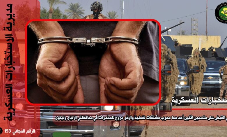 الاستخبارات العسكرية تلقي القبض على متهمين اثنين أحدهما مُهرب مشتقات نفطية والآخر مُروج للمخدرات في محافظتي الانبار ونينوى