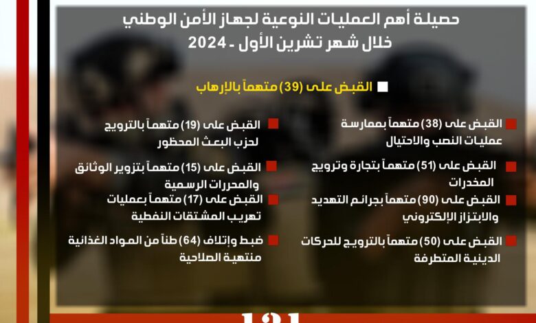 حصيلة أهم العمليات النوعية لجهاز الأمن الوطني خلال شهر تشرين الأول – ٢٠٢٤