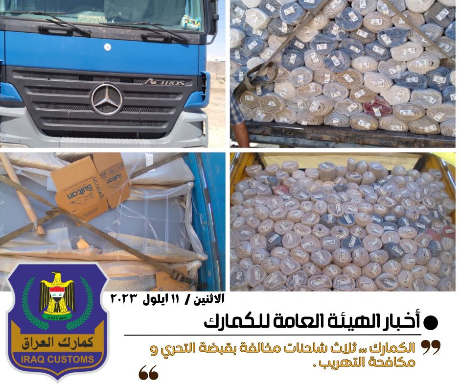 اعلنت الهيئة العامة للكمارك اليوم الاثنين المصادف ١١ أيلول ٢٠٢٣ عن تمكن قسم التحري و مكافحة التهريب في مديرية كمرك المنطقة الغربية من ضبط ثلاث شاحنات محملة ( اثاث ، سجاد ) مخالفة للشروط و الضوابط الاستيرادية .