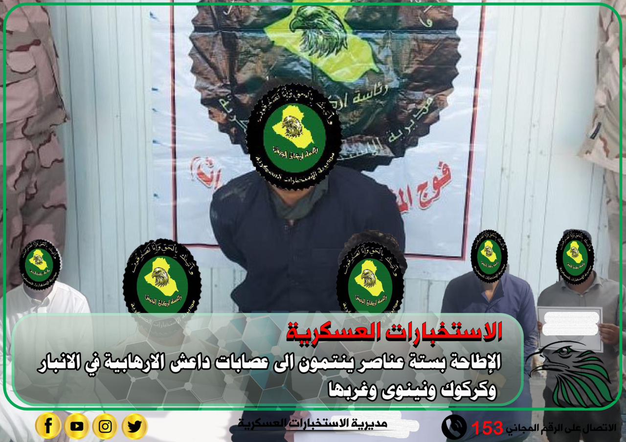 وفقاً لمعلومات استخبارية دقيقة لشعب الفرق السادسة والسابعة والثامنة والخامسة عشر والسادسة عشر التابعة الى مديرية الاستخبارات العسكرية وبالتعاون مع القوات الامنية الماسكة للأرض تم نصب كمائن في سيطرتي جباب والشهيد هيثم ومنطقة زردك وقرية البوير حيث اسفرت عن القاء القبض على ( 6 ) ارهابيين مطلوبين للقضاء وفق احكام المادة الرابعة من قانون مكافحة الارهاب في قضاء القائم وتلعفر والموصل وناحيتي المشاهدة والتون كوبري، وقد جرى تسليمهم الى جهات الطلب ميدانياً وأصولياً.