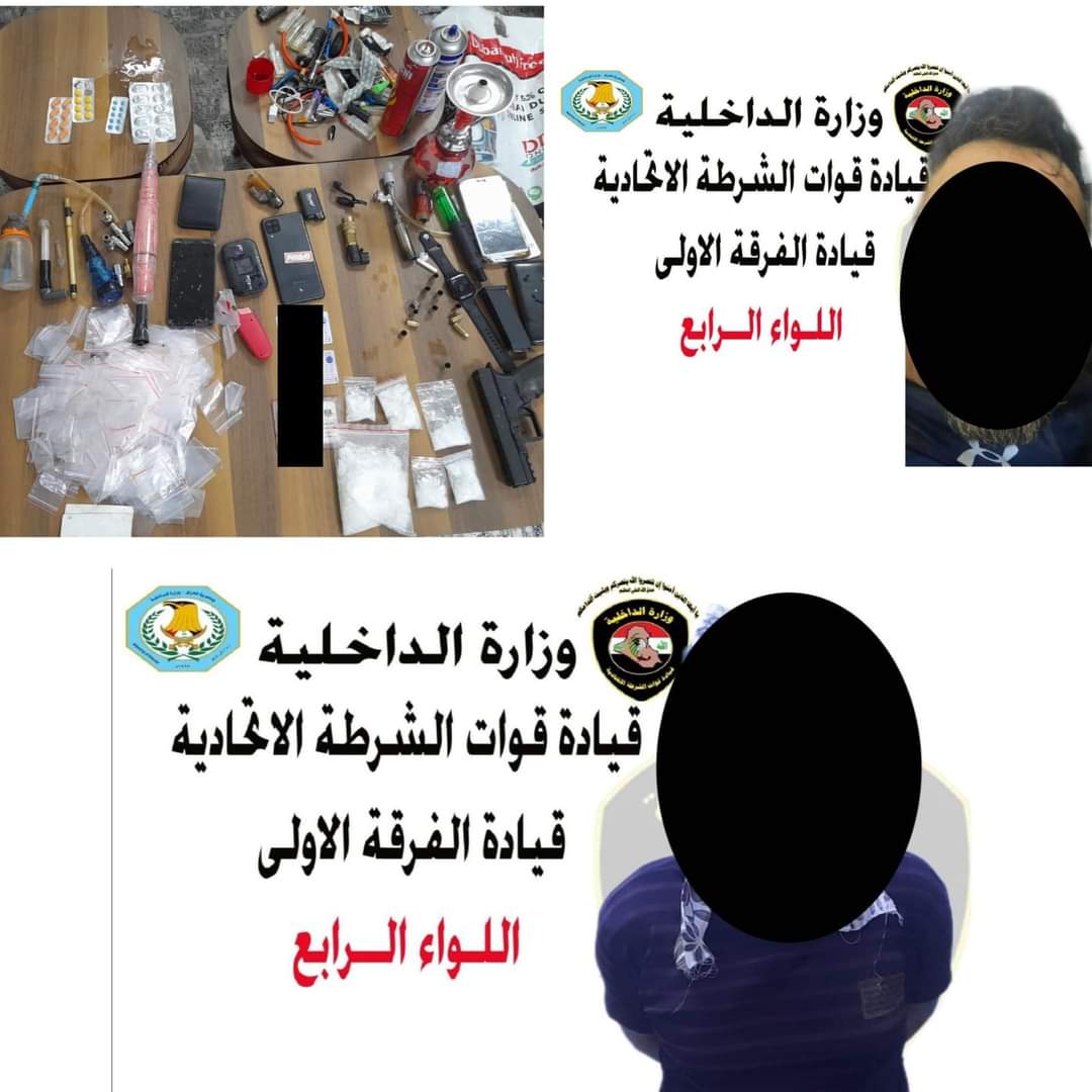 ضمن الجهود الأمنية المستمرة لقطعات الشرطة الاتحادية في ملاحقة الخارجين عن القانون من تجار ومتعاطي المواد المخدرة، تمكنت اليوم قوة من اللواء الرابع بالفرقة الأولى في الشرطة الاتحادية بالاشتراك مع مفارز استخبارات اللواء التابعة لوكالة الاستخبارات والتحقيقات الاتحادية ومفارز الأمن الوطني قاطع المدائن ضمن قاطع مسؤولية الفوج الثالث في منطقة (العريفية ) جنوب شرق بغداد من القبض على اثنين من تجار المواد المخدرة، وبحوزتهما كمية تقدر ب 300غرام من مادة الكريستال المخدرة و5 بايبات تستخدم للتعاطي، قنينتي اشعال، اركيلة عدد2 تستخدم للتعاطي وأكثر من 50 كيس صغير يستخدم لتوزيع المواد المخدرة بالإضافة الى حيازتهما سلاح غير مرخص مسدس كلوك كما تم تعرضهما للقوة المنفذة للواجب .