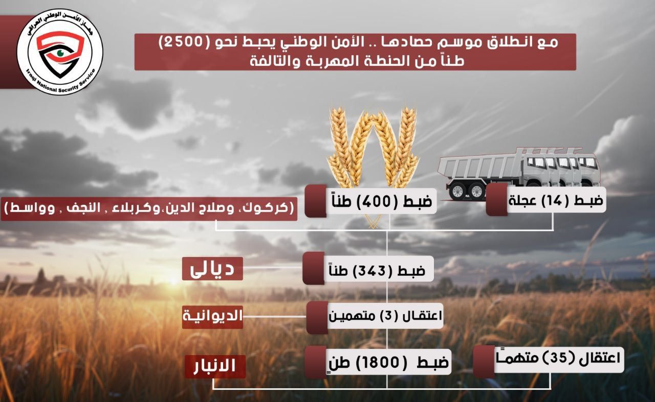 تنفيذاً لتوجيهات السيد رئيس مجلس الوزراء المحترم الرامية إلى تعزيز الخطة الأمنية لمنع تهريب محصول الحنطة ومحاسبة المهربين تمكنت مفارز جهاز الأمن الوطني وبناءً على معلومات استخبارية واستحصال الموافقات القضائية من ضبط (١٤) عجلة نوع تريلة محملة بأكثر من (٤٠٠) طنٍ من مادة الحنطة المخصصة لمفردات السلة الغذائية في (كركوك، وصلاح الدين، وكربلاء، وواسط) والقبض على سائقيها