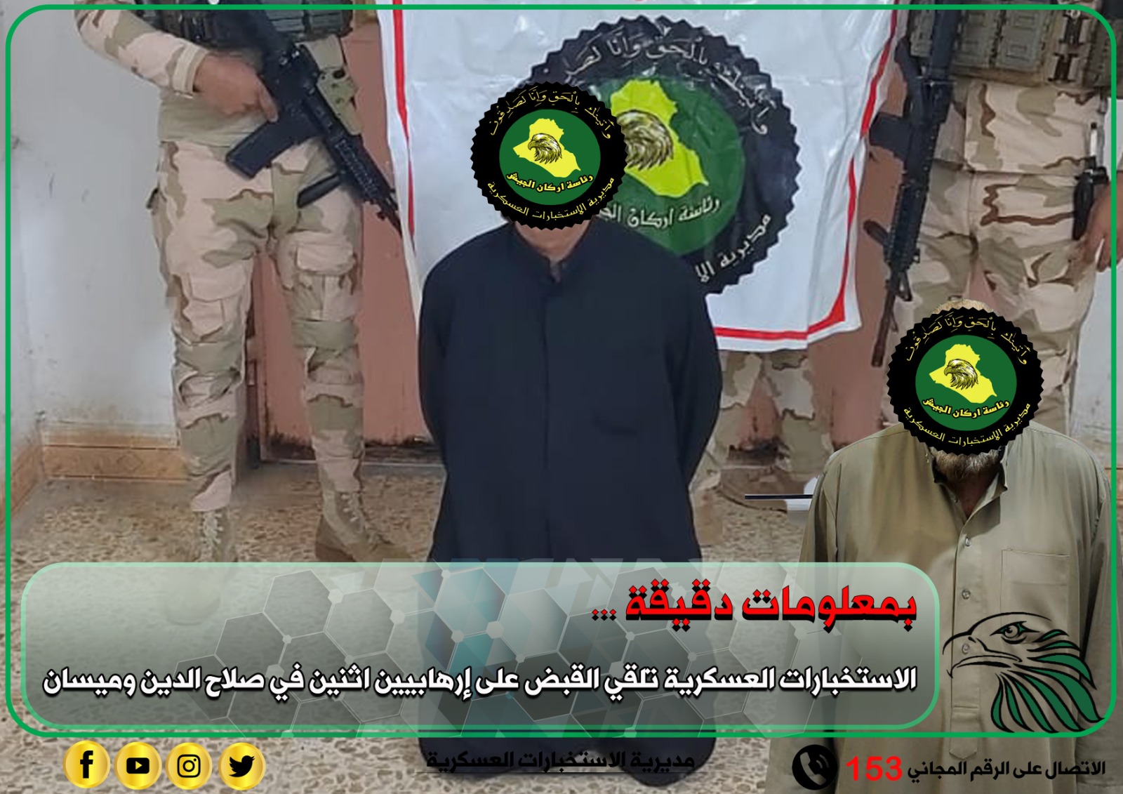 بعمليتين منفصلتين وبناءً على معلومات استخبارية دقيقة لقسم وشعبة قيادة عمليات ميسان والفرقة الرابعة عشر التابعة إلى مديرية الاستخبارات العسكرية وبالتعاون مع القوات الأمنية تم نصب كمينين محكمين في منطقة الجمشة وناحية الزاب وعلى أثرهما ألقي القبض على إرهابيين اثنين مطلوبين للقضاء وفق أحكام المادة 4 إرهاب في قضاء الشرقاط و ناحية العزير وتم تسليمهما إلى جهة الطلب أصولياً.