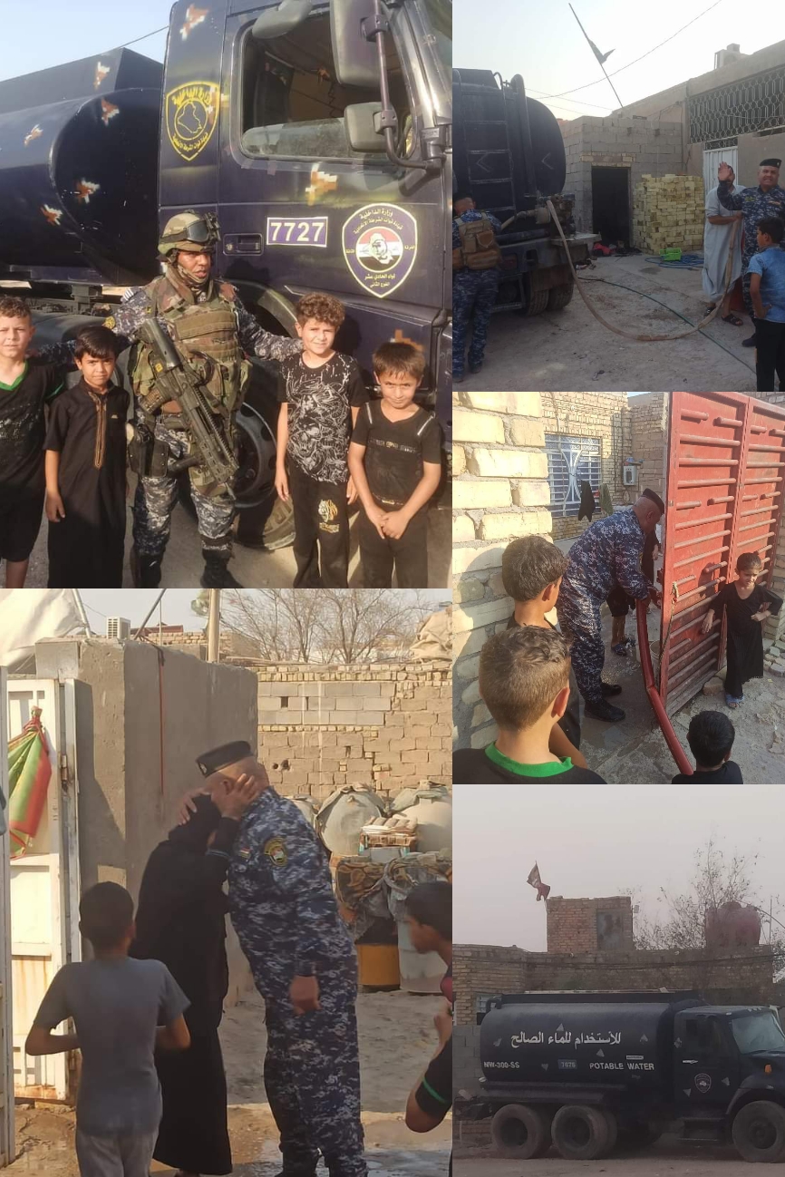تنفيذا لأوامر معالي وزير الداخلية وتوجيهات السيد قائد قوات الشرطة الاتحادية الفريق “صالح ناصر العامري” بتقديم الدعم الخدمي والإنساني وإسناد المؤسسات الحكومية ضمن قواطع المسؤولية ، نظم أبطال اللواء الحادي عشر وبإشراف آمر اللواء العميد “قائد ثجيل” حملة صيانة وتصليح للأنابيب بالإضافة حملة اسقاء لتوزيع المياه الصالحة للشرب في منطقة”الرحمة “ضمن قاطع المسؤولية في محافظة ميسان من خلال تخصيص عجلات تقوم بشكل مستمر بتوزيع المياه الى المواطنين في مبادرة لاقت إشادة واسعة من اهالي المنطقة خصوصا بعد شحة المياه في الايام الماضية مثمنين دور ابطال الشرطة الاتحادية وبالجهود التي تعزز علاقة المواطن مع الجهات الأمنية .