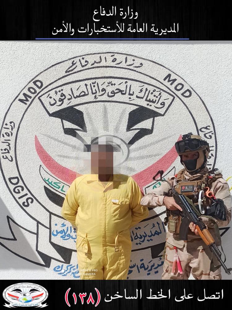 ضمن سلسلة العمليات النوعية التي تنفذها المديرية العامة للاستخبارات والامن بوزارة الدفاع بهدف ملاحقة فلول العصابات الارهابية والقصاص منهم وبمعلومات استخبارية دقيقة تمكنت مفارز مديرية استخبارات وامن كركوك التابعة الى المديرية ذاتها من القاء القبض على احد عناصر عصابات داعش الارهابية الخطيرة، الذي شارك بعمليات ارهابية عديدة ابرزها زرع العبوات الناسفة وتفجير منازل القوات الامنية في محافظة صلاح الدين بالاضافة الى عملة كمقاتل ومساعدة العصابات الارهابية بنشر مفارز امنية داخل قضاء تكريت.