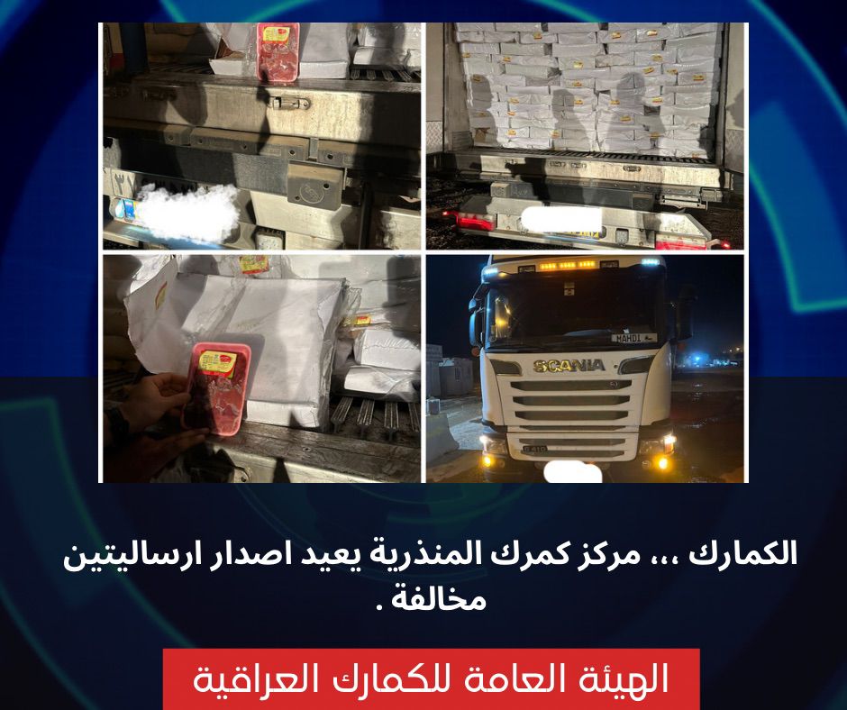 اعلنت الهيئة العامة للكمارك اليوم الاربعاء المصادف ٩ اب ٢٠٢٣ عن قيام مركز كمرك المنذرية الحدودي باعادة ارسالية الى الجانب الايراني محملة ( مقاطع المنيوم مختلفة الاشكال والاحجام ) بكمية (٢٥) طن لعدم مطابقتها الفحص ومادة (الكبدة) بكمية (٢٤) طن مخالفة للشروط الاستيرادية .