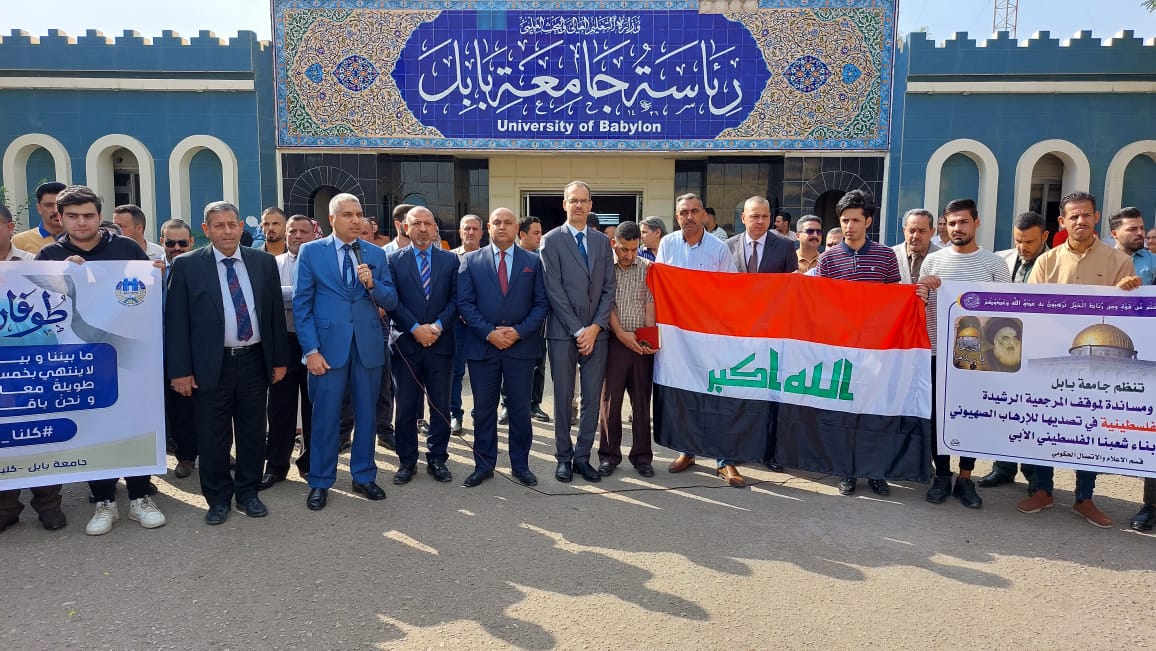 نظمت جامعة بابل وقفة تضامنية مع الشعب الف لس طي ني واحتجاجا على ما يقوم به الاح ت لال الص هي وني من جرائم ضد الإِنسانية نصرة للشعب الف لس طي ني في حقه المشروع في الدفاع عن ارضه واحتجاجا على ما يقوم به الك ي ان