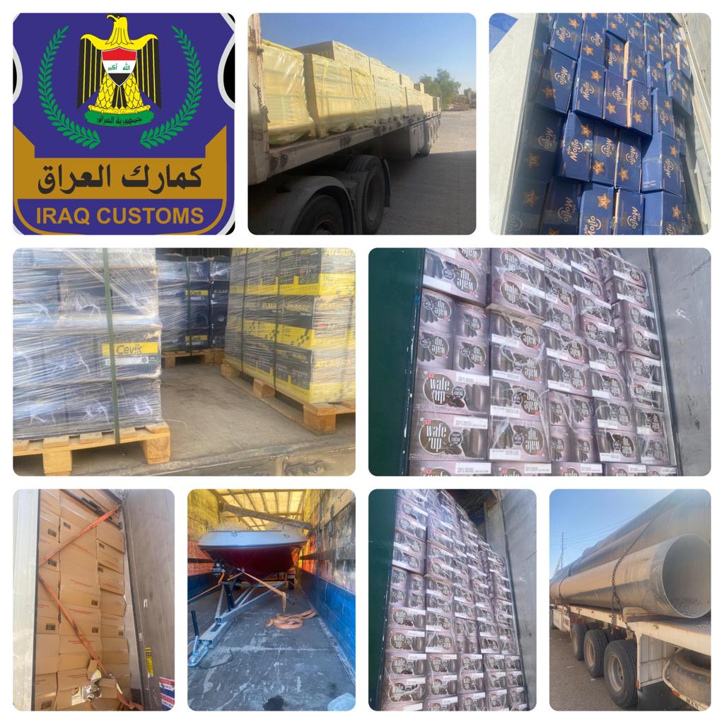 اعلنت الهيئة العامة للكمارك اليوم الثلاثاء الموافق 2022/6/21 عن قيام قسم التحري ومكافحة التهريب في مديرية كمرك المنطقة الوسطى من ضبط 16 شاحنة عند مداخل مدينة بغداد تحتوي على مواد متنوعة ( زورق فايبر كلاس وبطاريات جافة و انابيب وفلاتر دهن سيارات و بلاط سيراميك وعارضات برادات وخشب والواح من الجص وكاشي فرفوري وكيك محشي وحلويات وباودر للمشروبات الغازية ) مخالفة لضوابط وشروط الاستيراد .