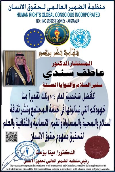 منظمة الضمير العالمي لحقوق الإنسان تمنح عاطف سندي شهادة أفضل شخصية لعام 2024