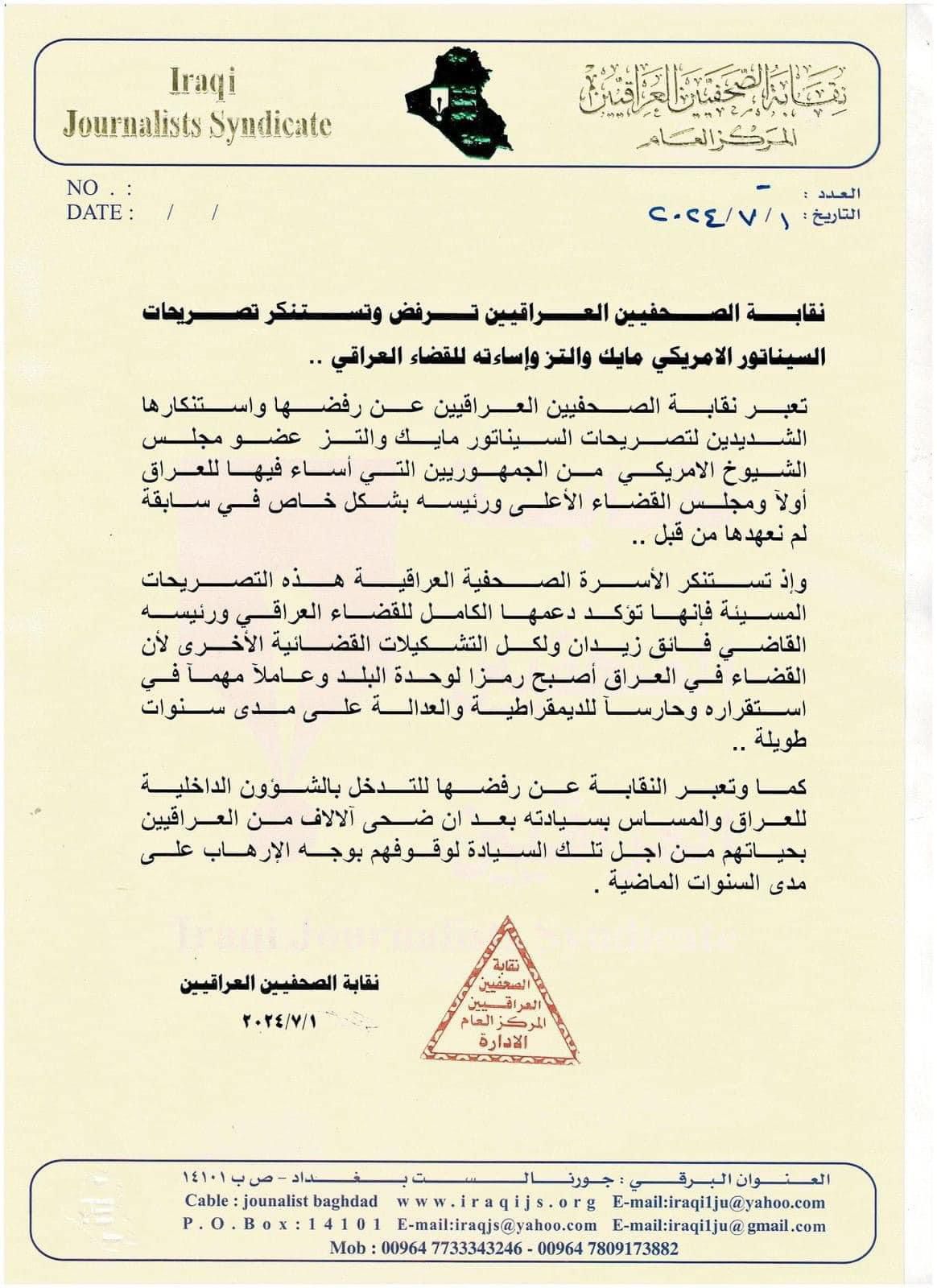 نقابة الصحفيين العراقيين ترفض وتستنكر تصريحات السيناتور الامريكي مايك والتز وإساءته للقضاء العراقي ..