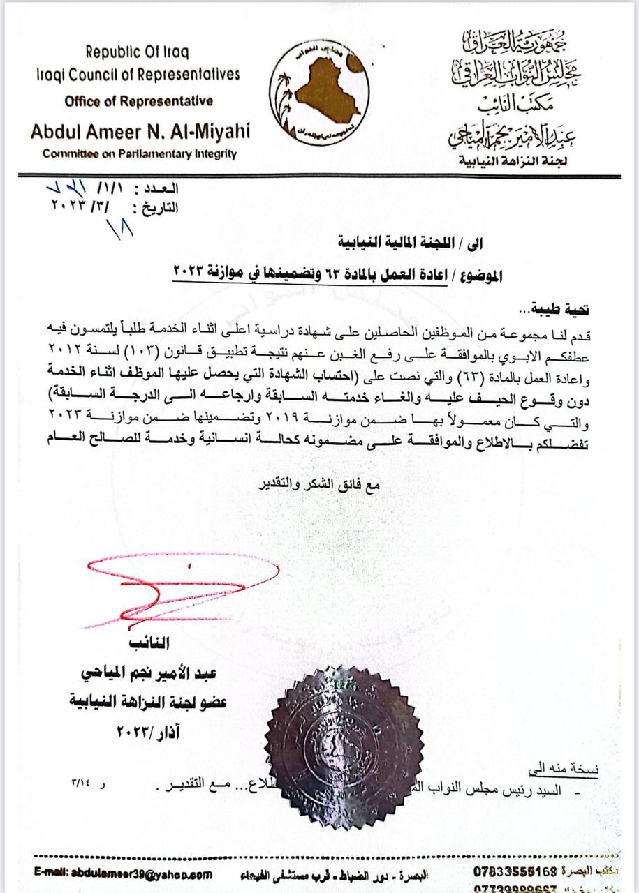 دعا رئيس كتلة العقد الوطني ، وعضو لجنة النزاهة النيابية ، النائب عبد الأمير الميّاحي ، اللجنة المالية النيابية إلى إعادة العمل بالمادة (٦٣) والتي نصت على (احتساب الشهادة التي يحصل عليها الموظف اثناء الخدمة ،