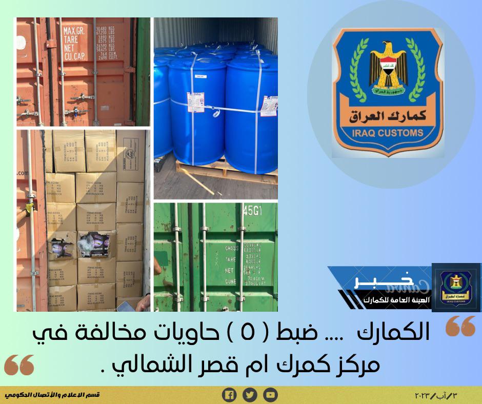 الهيئة العامة للكمارك تعلن اليوم الخميس المصادف [٣-٨-٢٠٢٣] عن تمكن مركز كمرك ام قصر الشمالي بضبط (٤) حاويات حجم ( ٤٠ ) قدم وحاوية اخرى (٢٠) قدم محملة بمواد (مواد اولية خطرة ، لعبة اطفال ، أنبولات ادوية بشرية ) ومواد متنوعة اخرى لمخالفتها الشروط و الضوابط الاستيرادية وتجاوزها المدة القانونية للبقاء داخل الميناء.