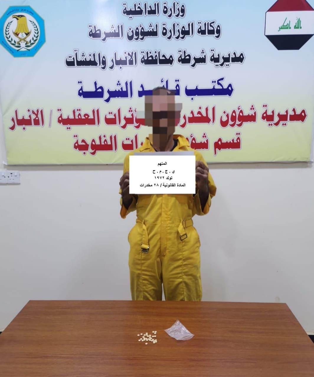 وبعد ورود معلومات من احد المصادر لمديرية شؤون المخدرات والمؤثرات العقلية بوجود شخص في قضاء الفلوجه بحوزته حبوب مخدرة وبعد استحصال الموافقات القضائية تم تشكيل مفرزة من قسم شؤون مخدرات الفلوجه والتوجه الى المكان المقصود والقاء القبض على المتهم ( ي. ج.م.ح)وتم ضبط بحوزته حبوب مخدرة وبعدد ( ٣١ حبة نوع كبتاجون ) تم تنظيم محضر اصولي بالمضبوطات اعلاه وتوقيف المتهم وفق المادة ٢٨ مخدرات حسب قرار السيد قاضي التحقيق المختص وايداعه التوقيف في مديرية شؤون المخدرات لاتخاذ الاجراءات القانونية بحقه .